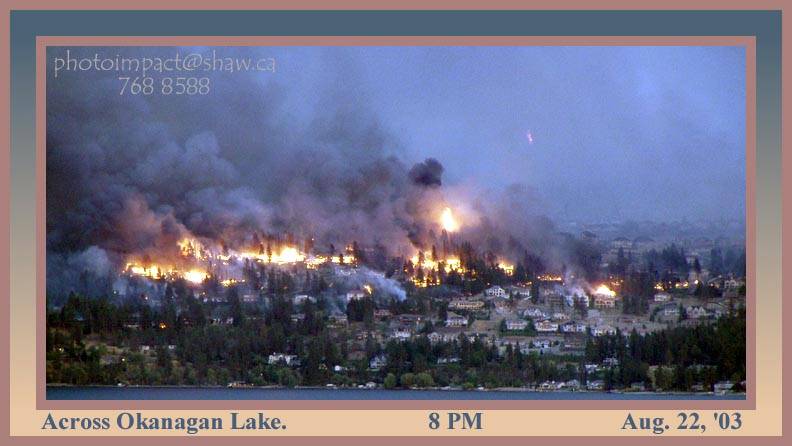 “KELOWNA, British Columbia (Reuters) - An estimated 30,000 people found themselves exiled from their homes in Kelowna, British Columbia, on Saturday by a wildfire so hot that at times it caused houses to explode….Emergency officials ordered 20,000 people to flee with only a few minutes warning on Friday evening as the forest fire began to "crown" -- …..Residents have been warned to stay out of forests and off wilderness roads and campsites in the southern half of the province, which is Canada's third largest and roughly the size of France and Germany combined.”