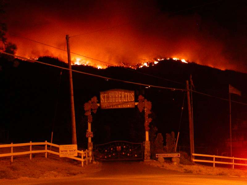 McWatters stressed that the whole valley was not on fire and that he was "amazed at how much green is still visible on the mountains. Clearly, there are spots that have been absolutely missed by the fire." He added, "I've had calls from all over the U.S. and Canada asking if we are OK, but Cedar Creek, St. Hubertus and Summerhill are the only wineries evacuated. The rest of us will rally to help St. Hubertus get back in business as soon as possible. The best thing people can do to help is just to come here and buy our wine."
