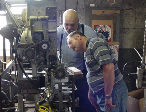 Grumbles stands with Tom, the owner of the 126 year old, family owned company, looking at a proprietary machine that processes material for use in wire wheels.