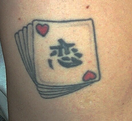 This one I designed myself - the Chinese word didn't come out Quite like I expected, but I like it! The two hearts represent my 2 daughters. . . my eldest passed away nearly 6 years ago, and I was going to get the top one inked Black. . . but I decided to leave it, and remember her as vital and alive. . .